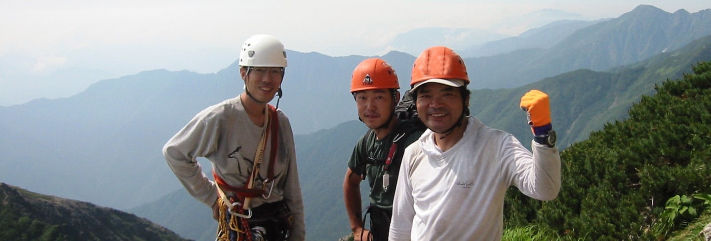 左端が私、まだクライミング初心者の頃 北岳バットレスにて