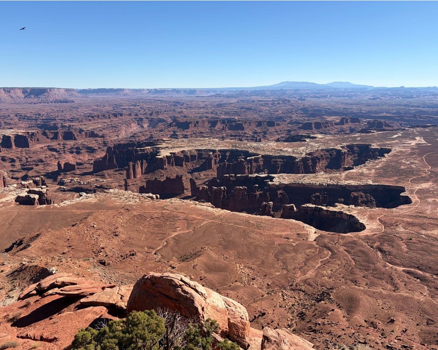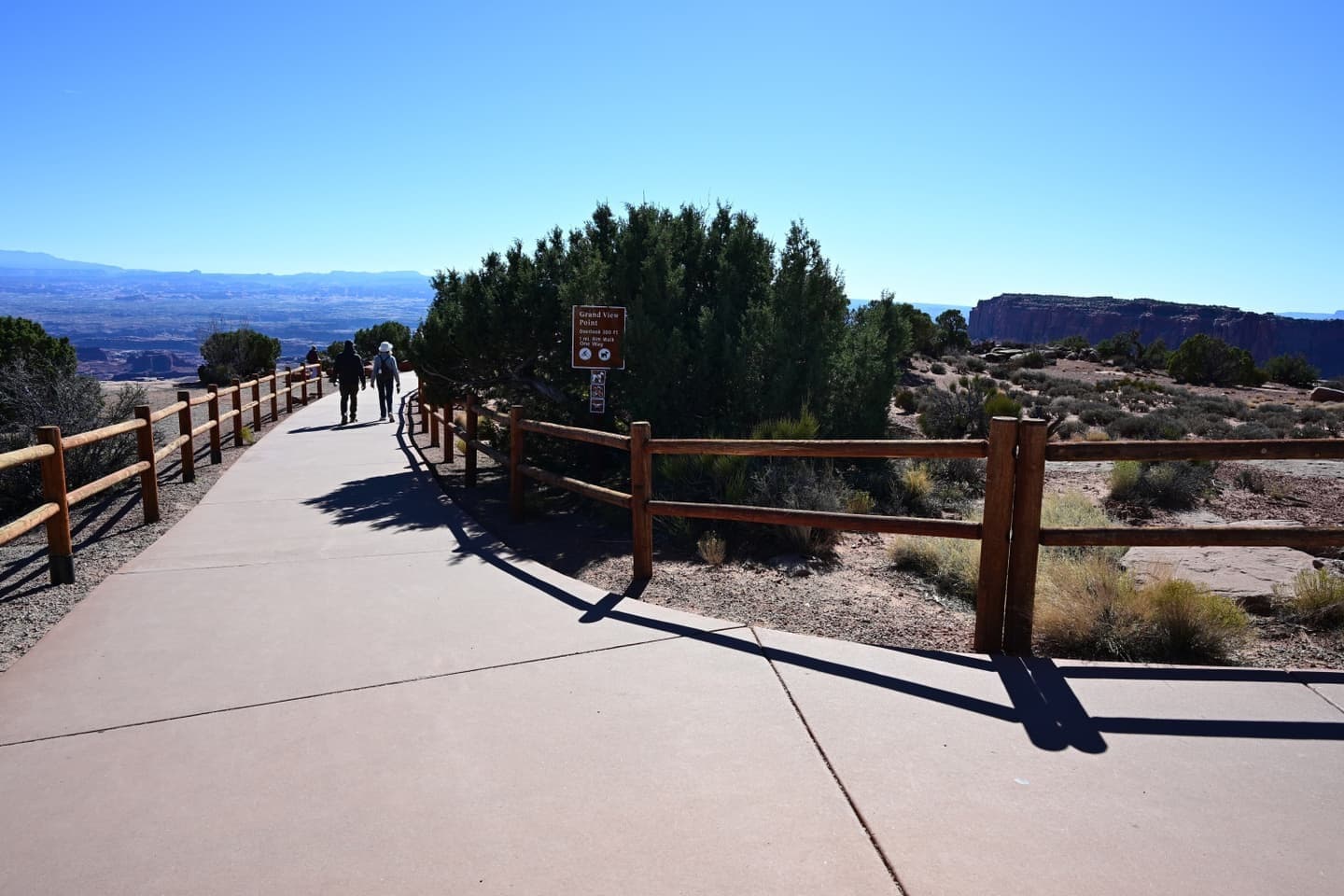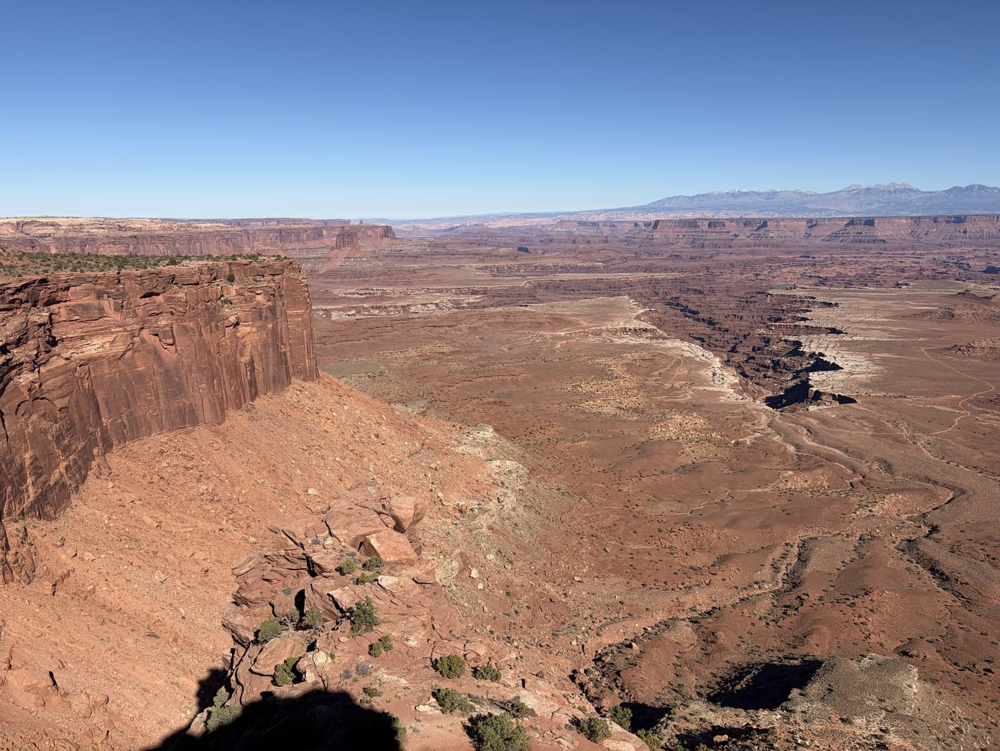 - キャニオランズの広さを一番実感できる展望台です。ビジターセンターからは少し遠いのですが、ここまで来ると「来てよかった」と思える景色が広がります。
