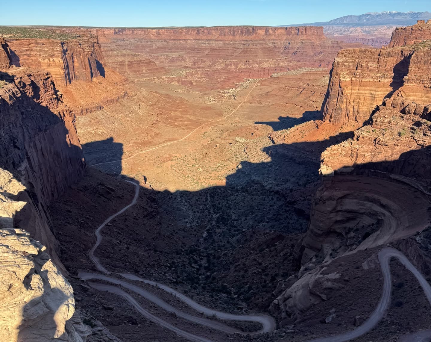 実際に走るには四輪駆動車が必要ですが、展望台から眺めるだけでも十分にスリルを感じられます。崖の壁面に沿って車が小さく動いていく姿は、まるでジオラマのようで、キャニオランズならではの景観の一部として楽しめます(私は見ただけです)