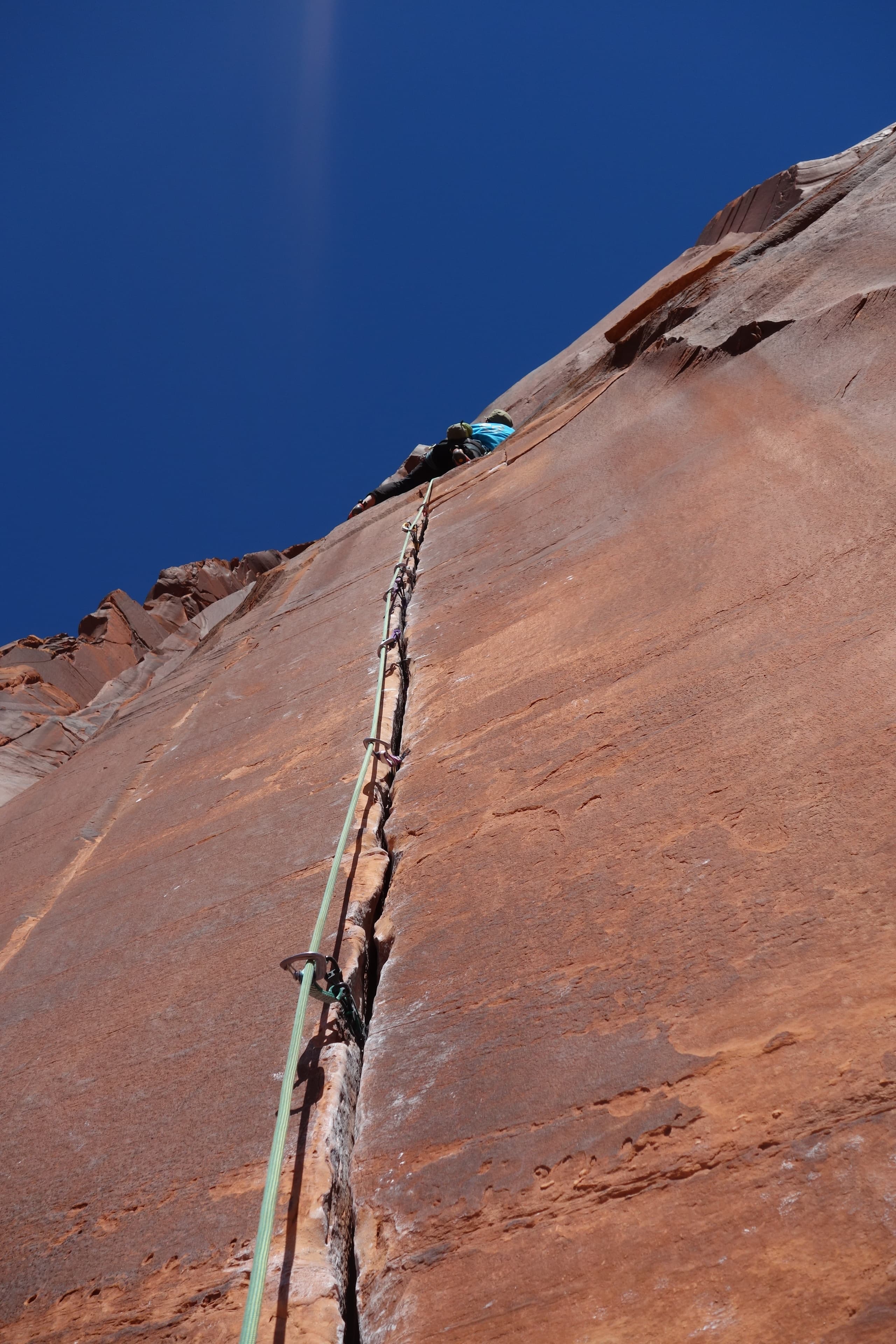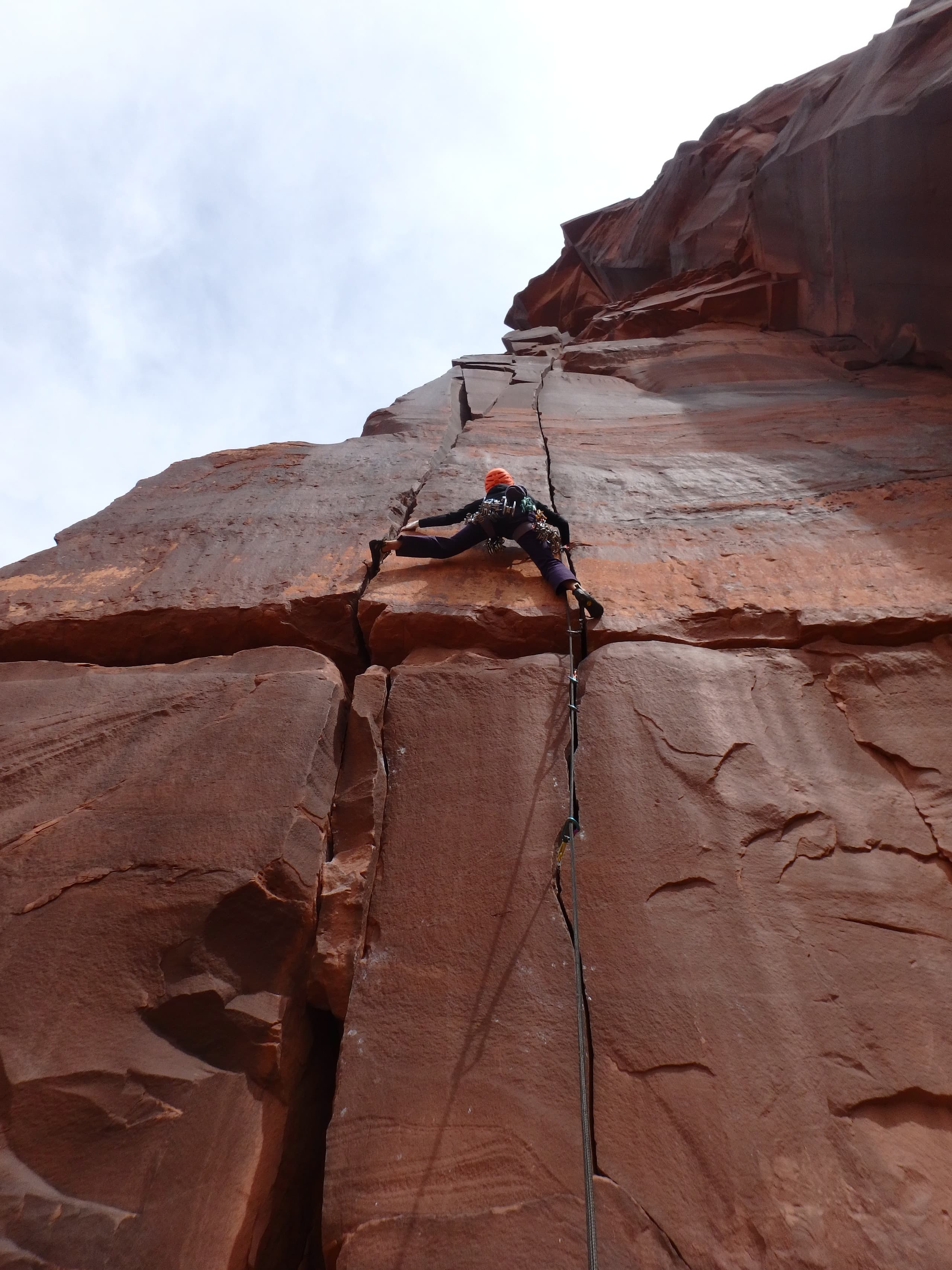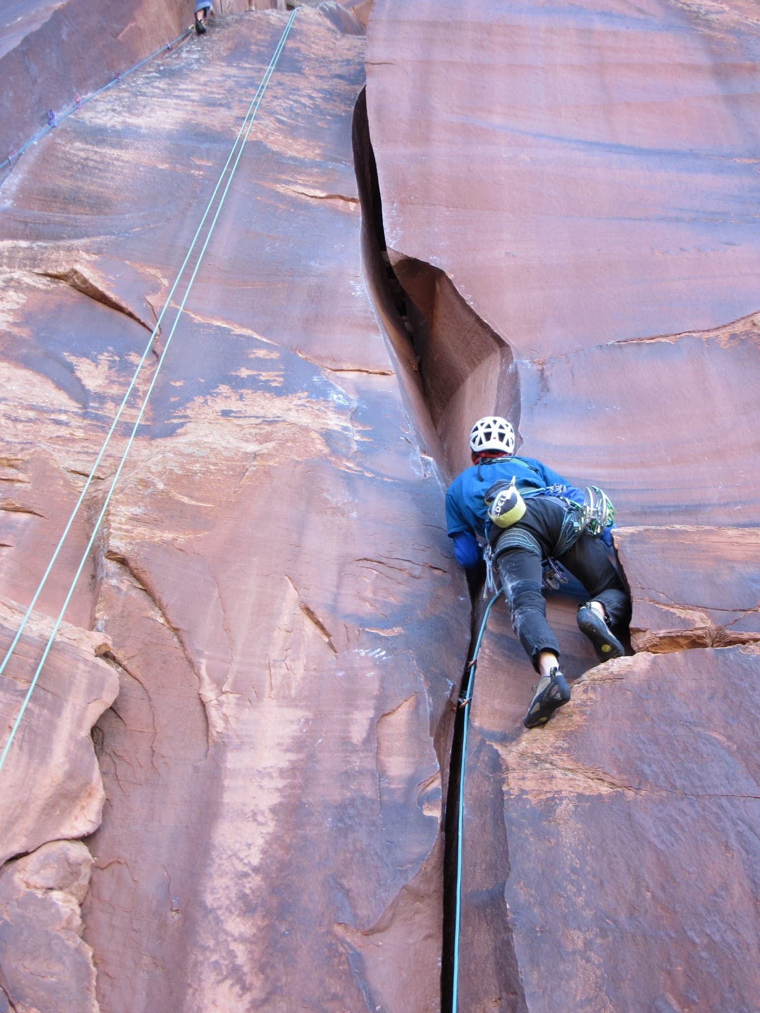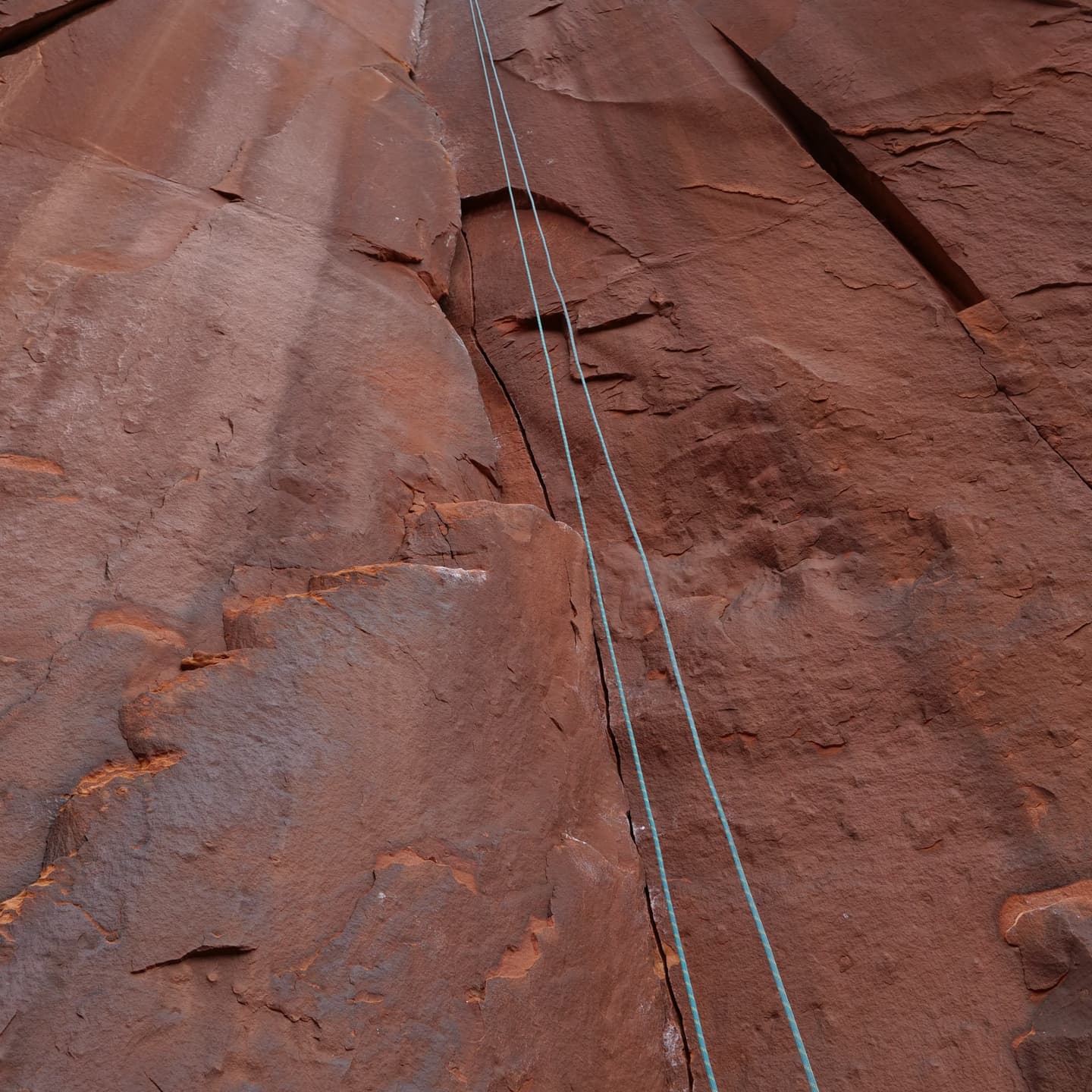 暗いので目が慣れるまでどこ登るの?だが、見えてくるルートは一直線に駆け上がり神秘的。赤キャメサイズなので手の厚い人には修行(私、該当)