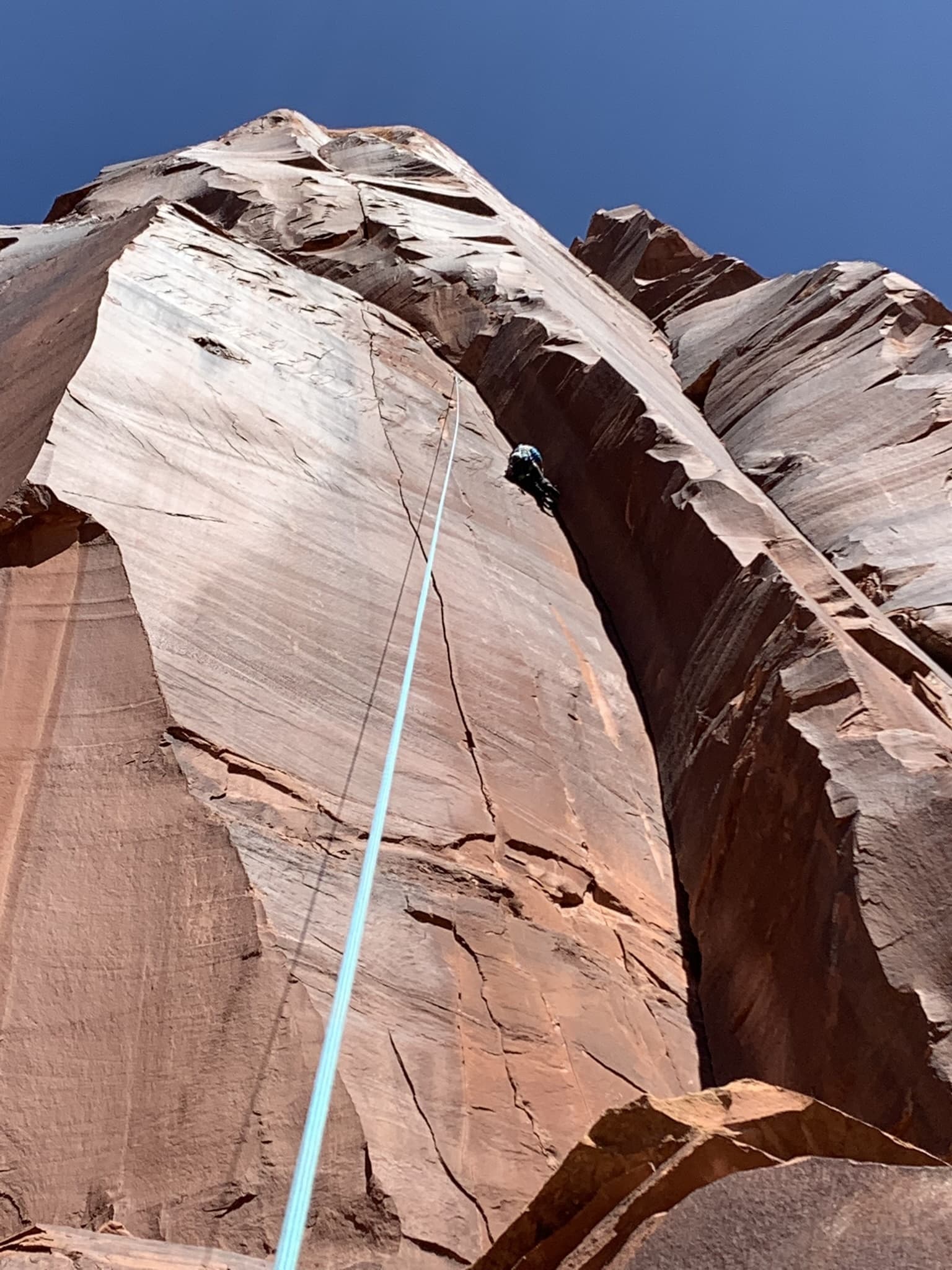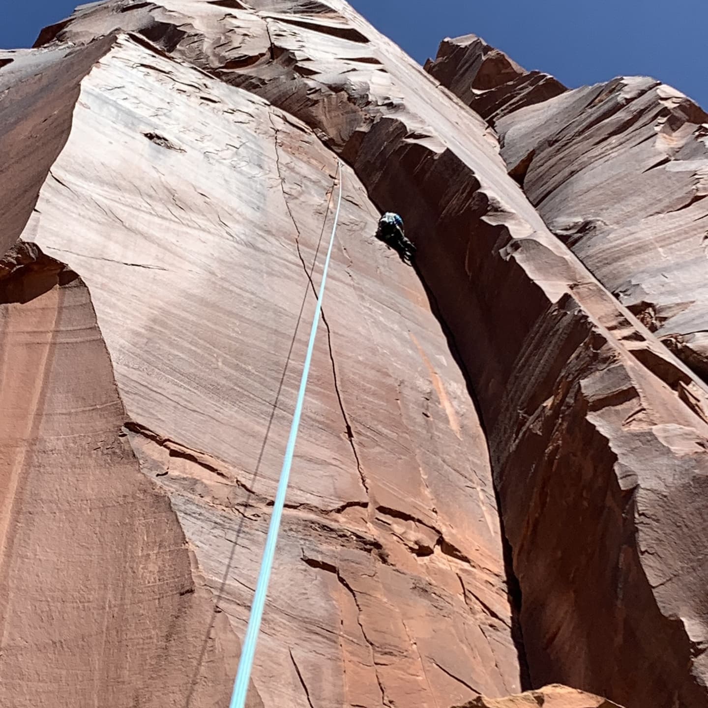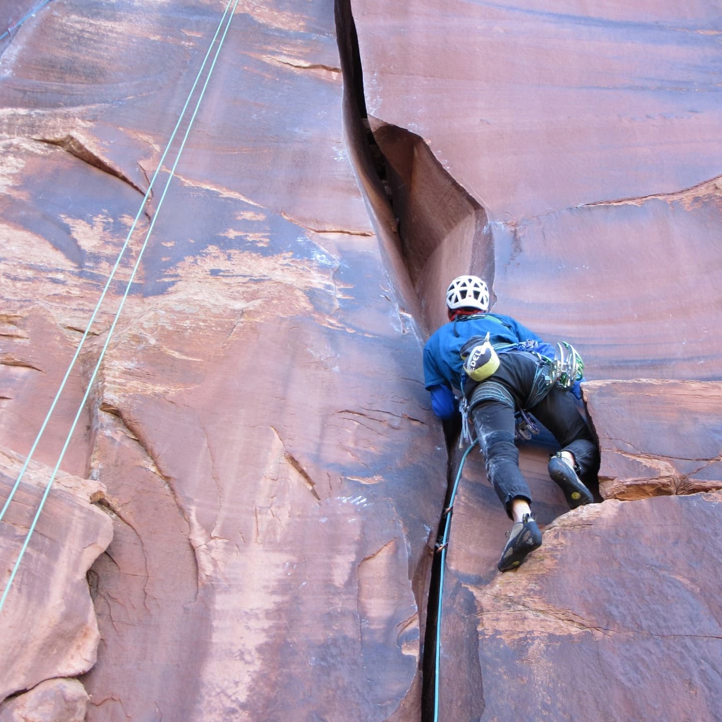 暗いので目が慣れるまでどこ登るの?だが、見えてくるルートは一直線に駆け上がり神秘的。赤キャメサイズなので手の厚い人には修行(私、該当)