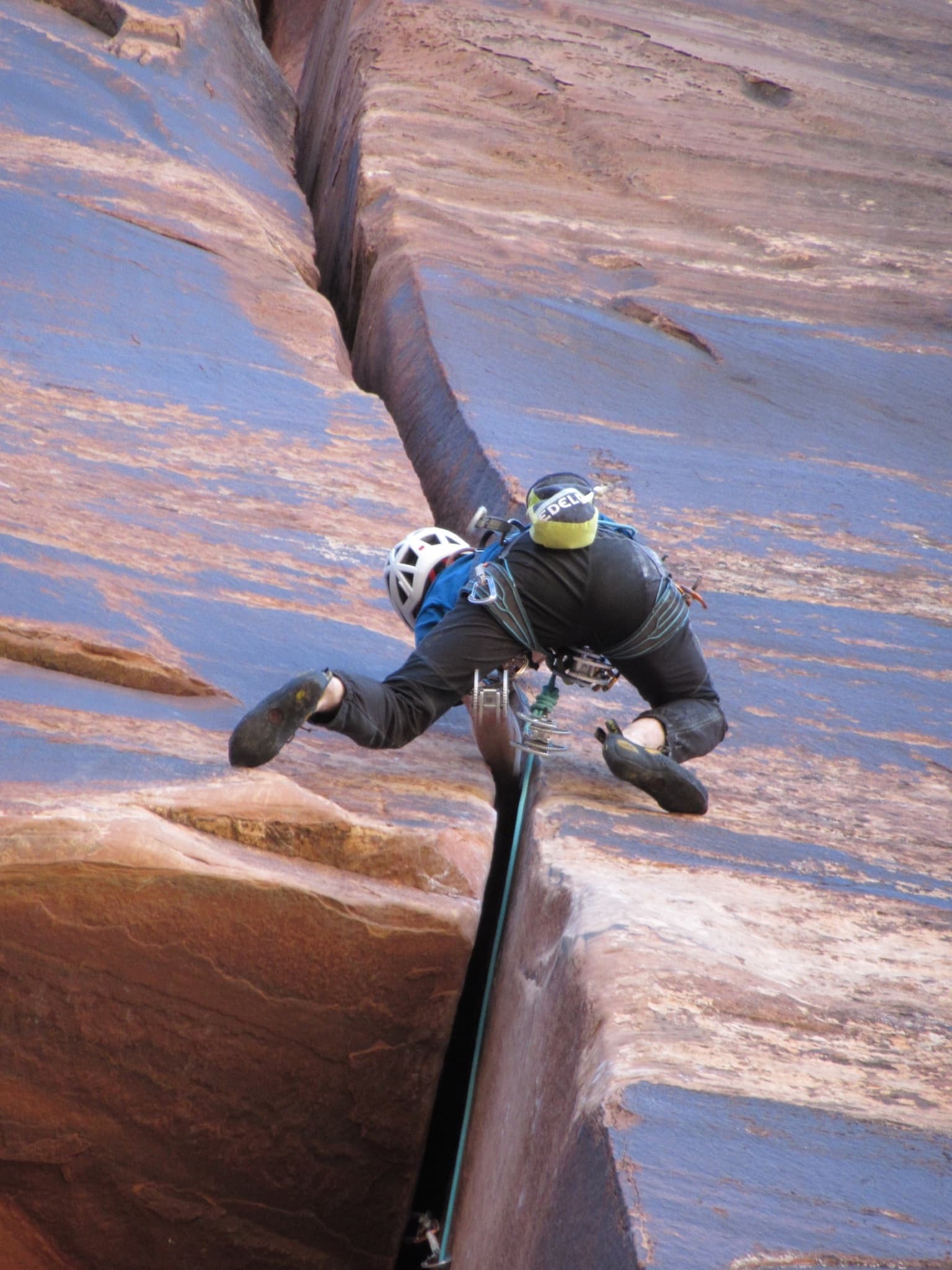 上部はオーバーハングしたクラック。青キャメサイズが続き手の厚めの人には快適なハングだが、女性には厳しいサイズかも。