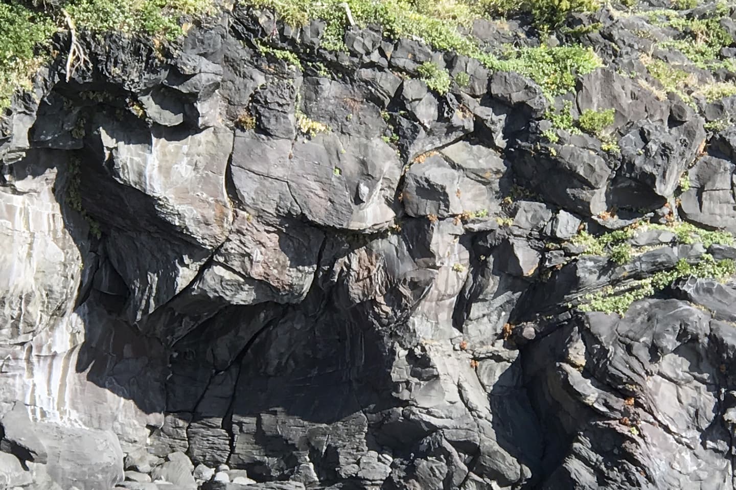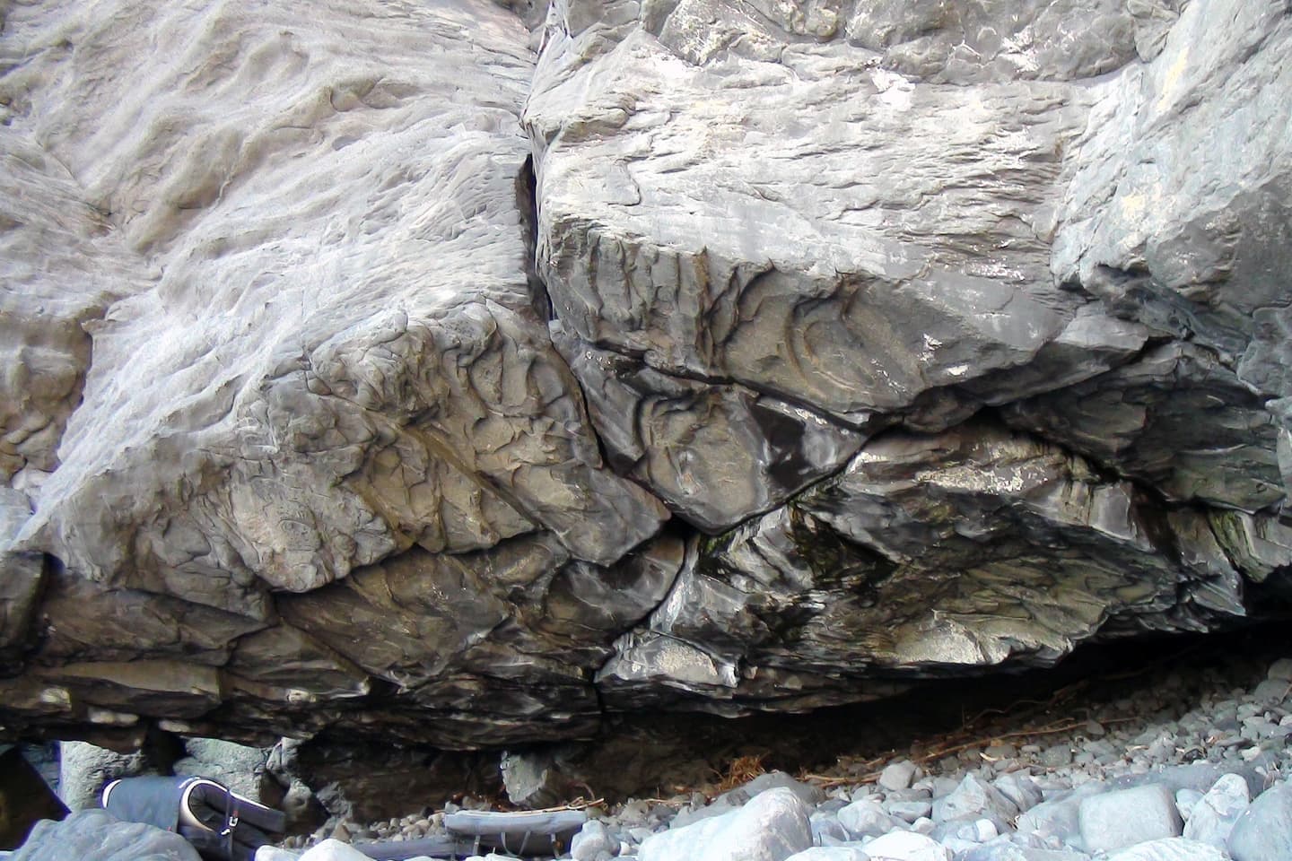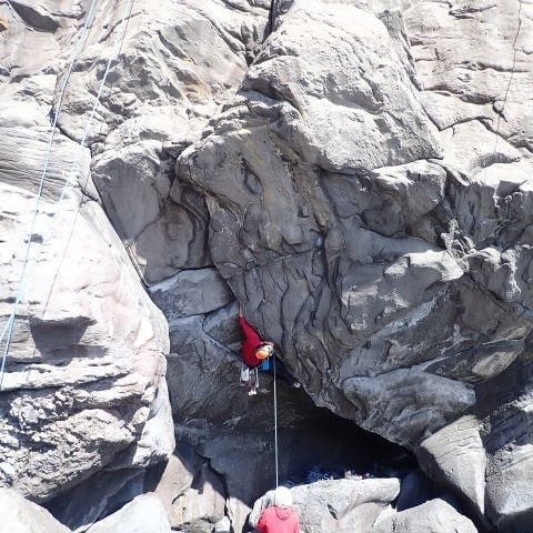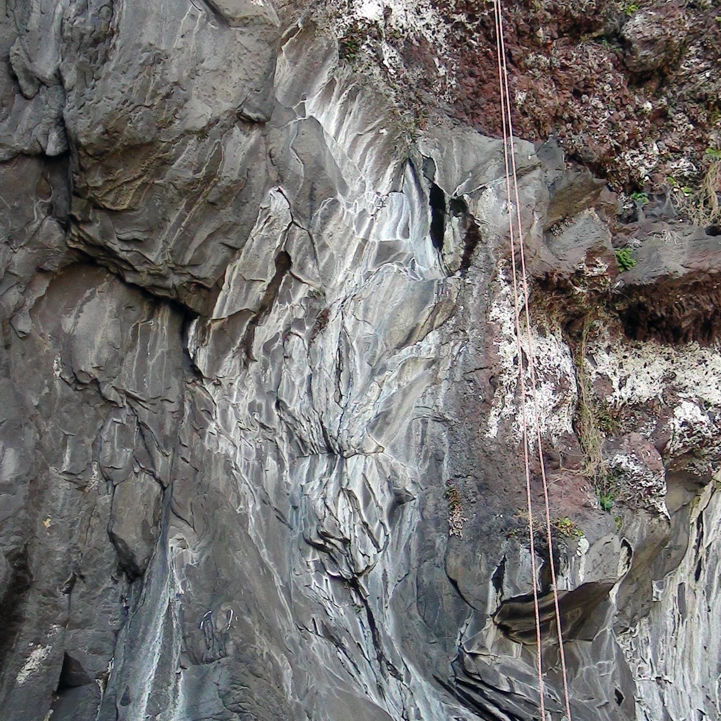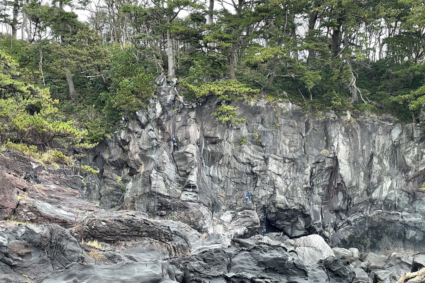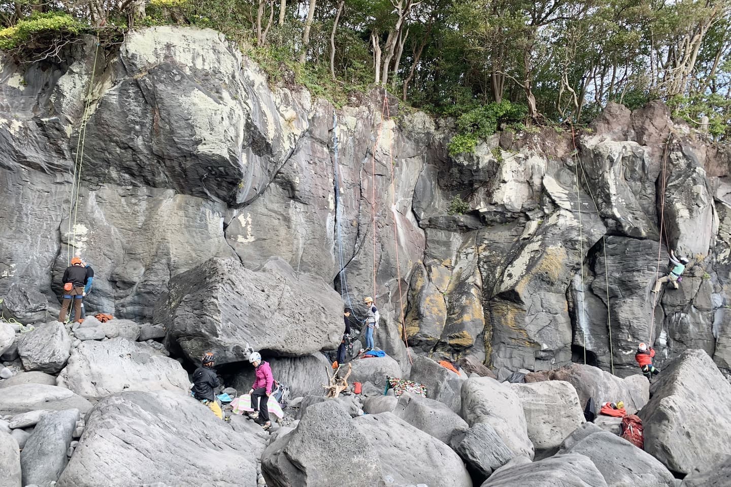 アプローチはカメノテの壁を登り懸垂下降です。岩のトンネルをくぐると写真の壁が見えます。