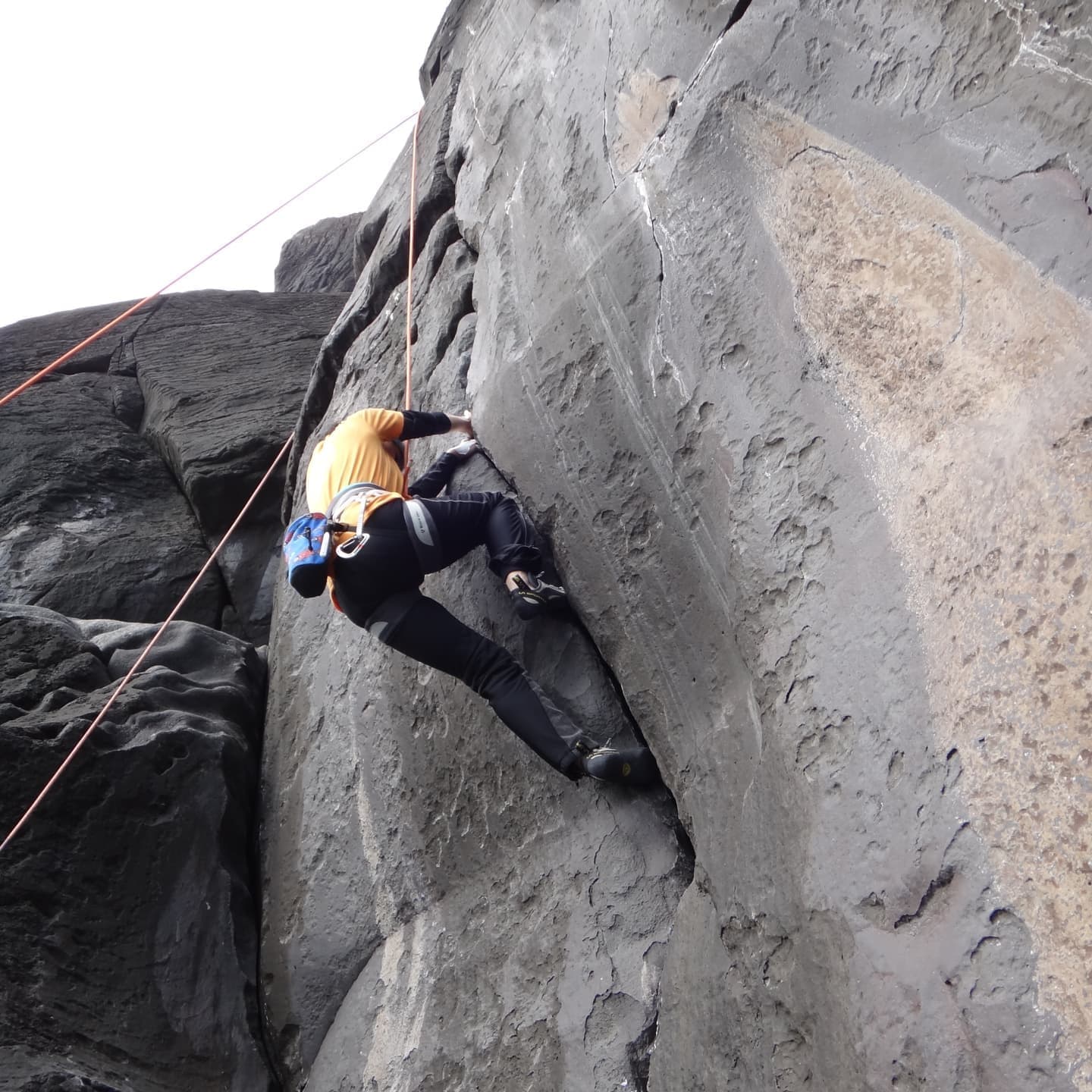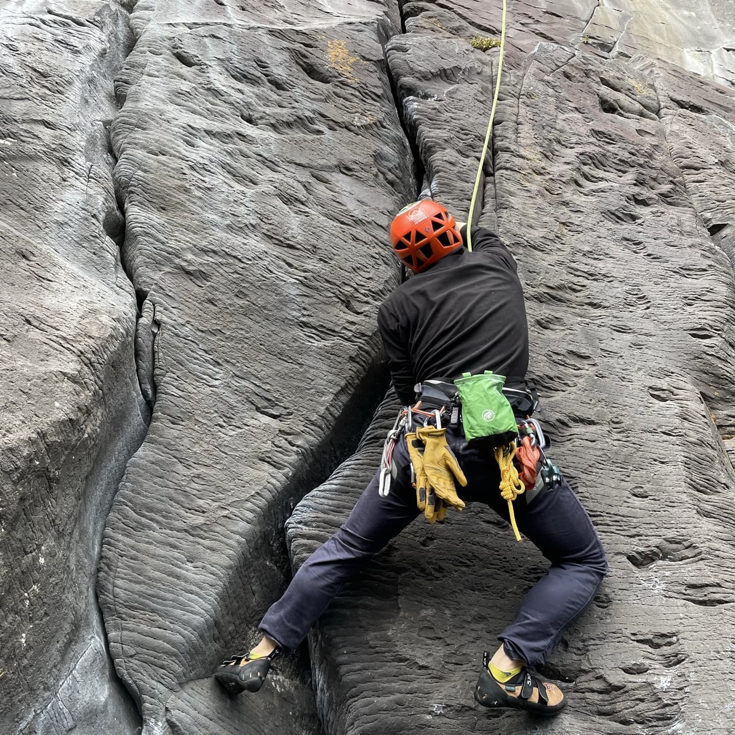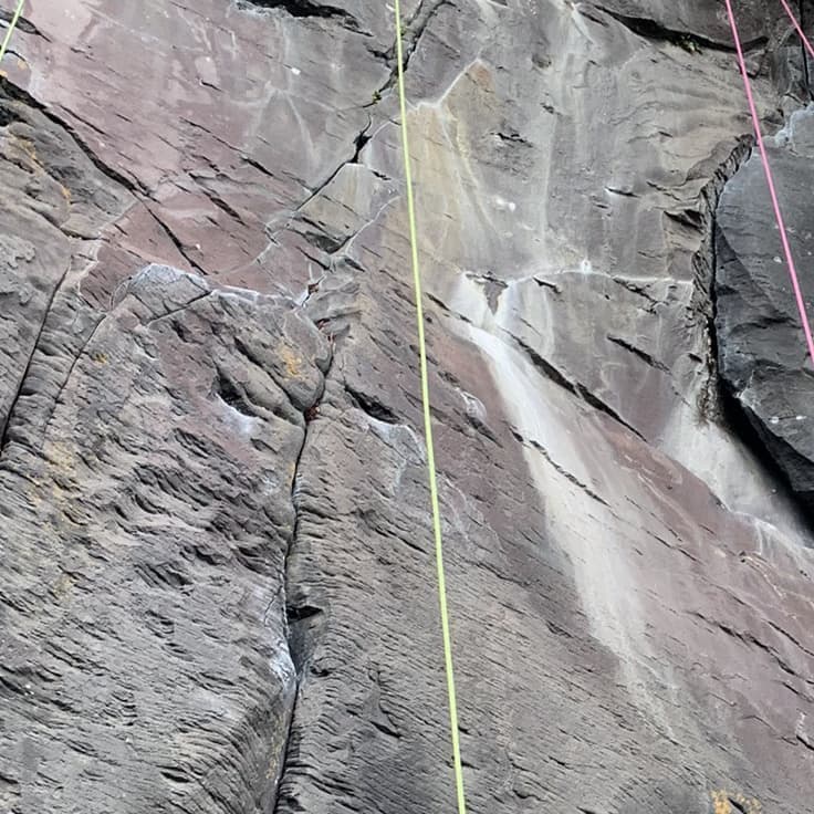 隣のライトに比べプロテクションセットは難しくなる。中間の動くクラックは最初はびっくりする。抜け口が草付きごろごろなので注意が必要。