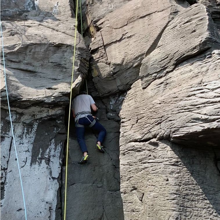 Wクラック。右から行ったら次は左と二度楽しめる。ハングは足使いをよく考えて登ればグレードの通り。