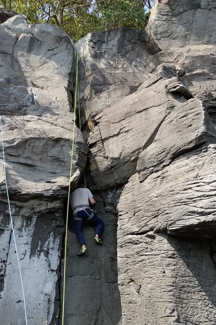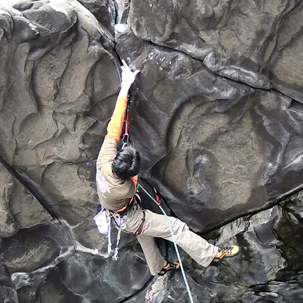 このエリアの看板ルート。カムの座りは良い。後半のムーブは思い切って行くと打開されるが、初見だとかなりわかりづらい。