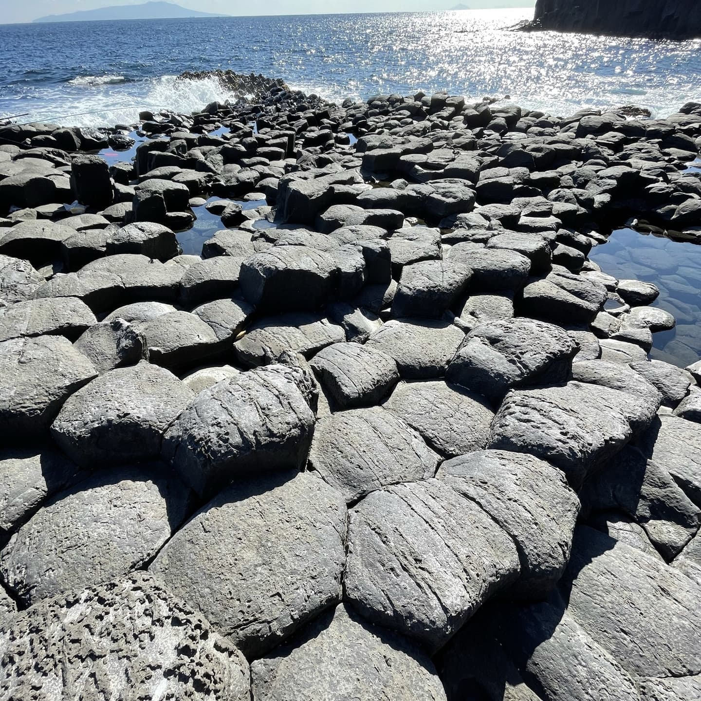 竹林を抜け、磯を渡ると見事な柱状節理でいっぱいです。ここは釣りのポイントでいつも釣り師がいます。