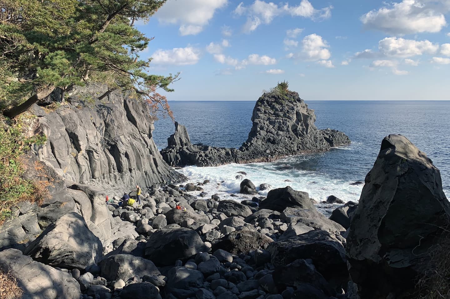 伊東市富戸から赤沢までの広大な範囲に、クラックを中心としたエリアが点在しています。4000年前、大室山の噴火で流れ出た溶岩が城ヶ崎海岸を作りました。