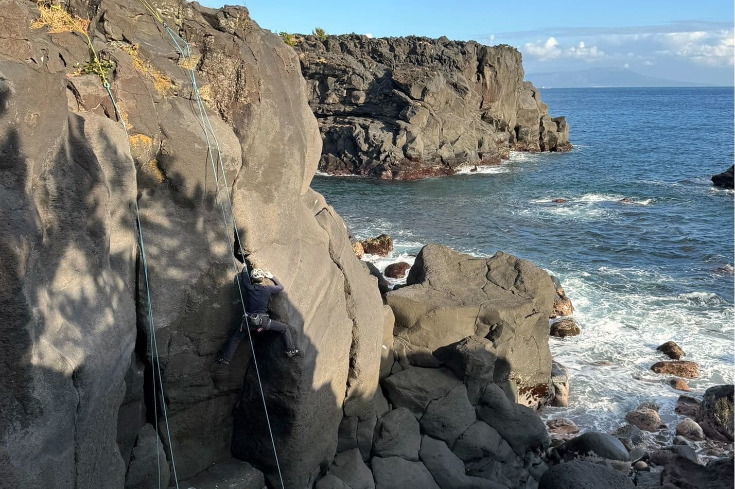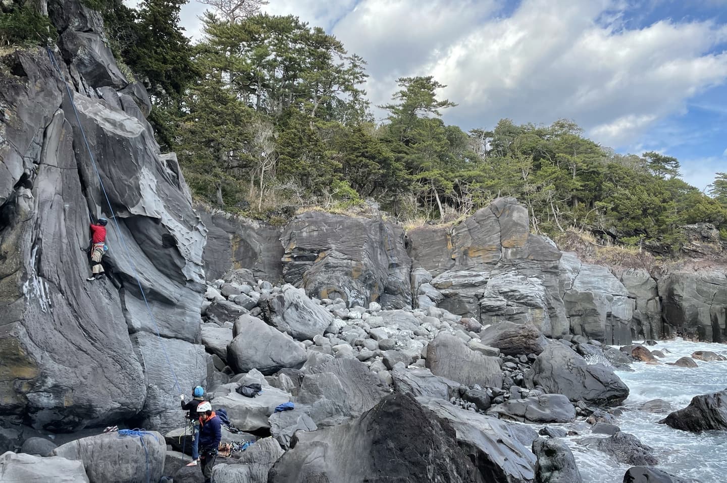 城ヶ崎の中では規模が大きく壁の高さもあり迫力満点です。とても暖かいエリアで、昼間はポカポカです。ルートは10台が多いので練習に良い環境です。上部がもろくなっていて、終了点を作る時は注意しないと落石を誘発しますので気をつけましょう。
