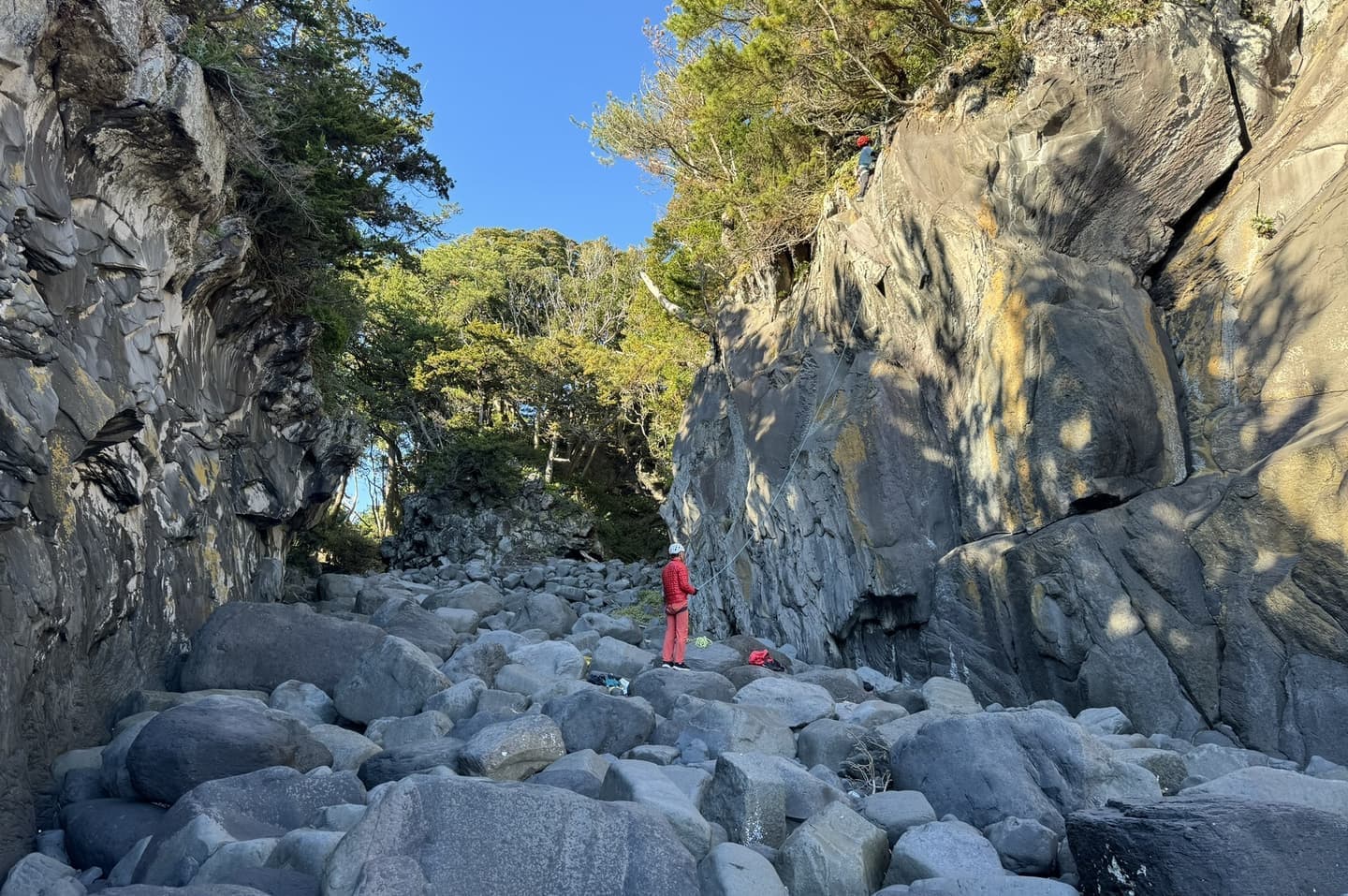 100岩場にはかなりのルートが載ってるが、登られているのは手前のルートで、奥は懸垂下降しないと取り付けない。