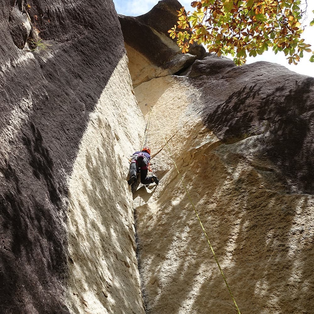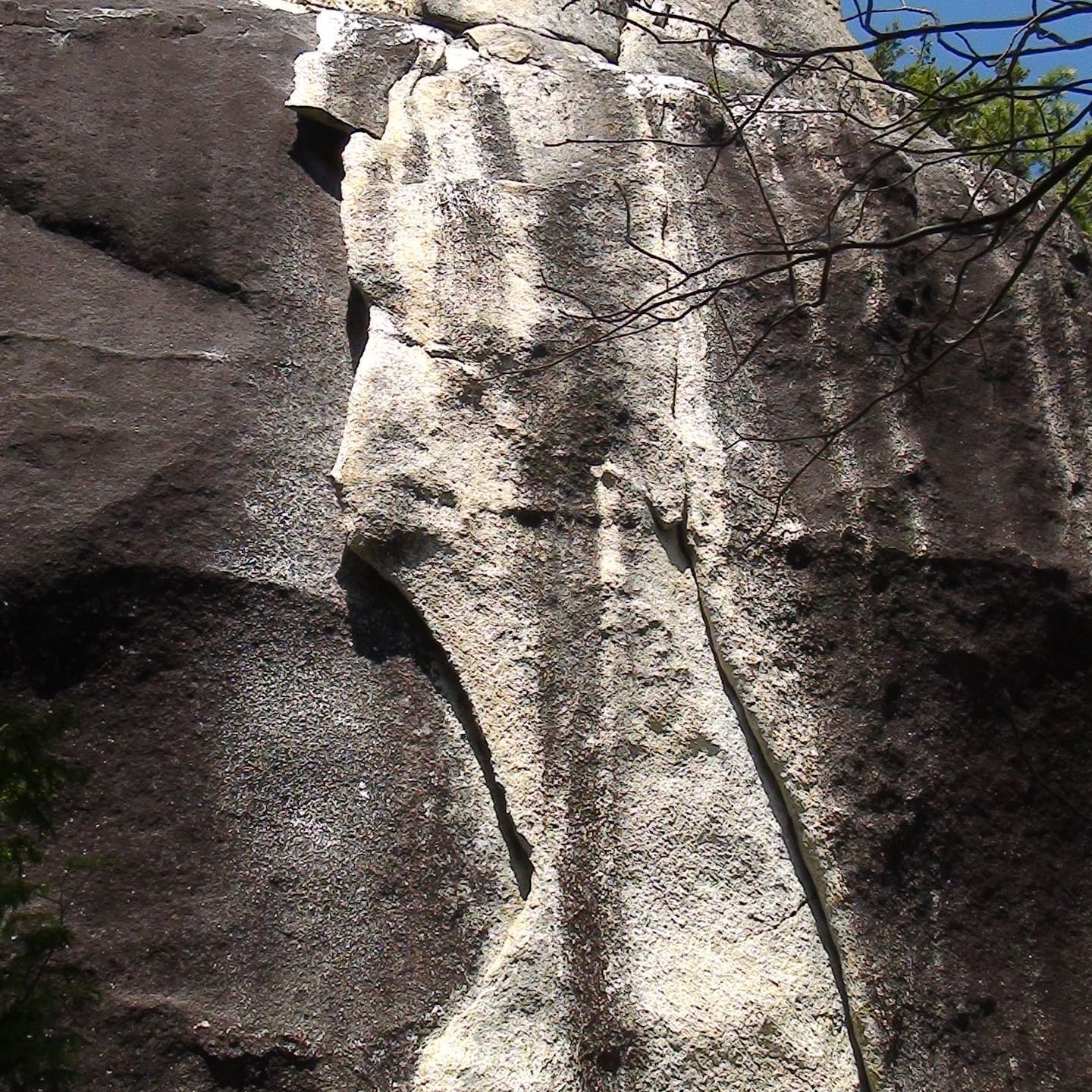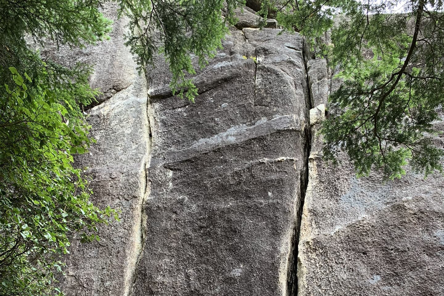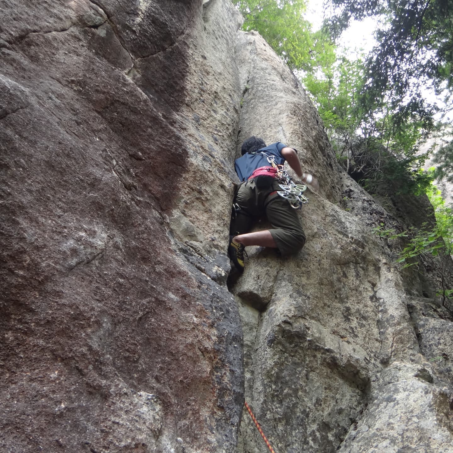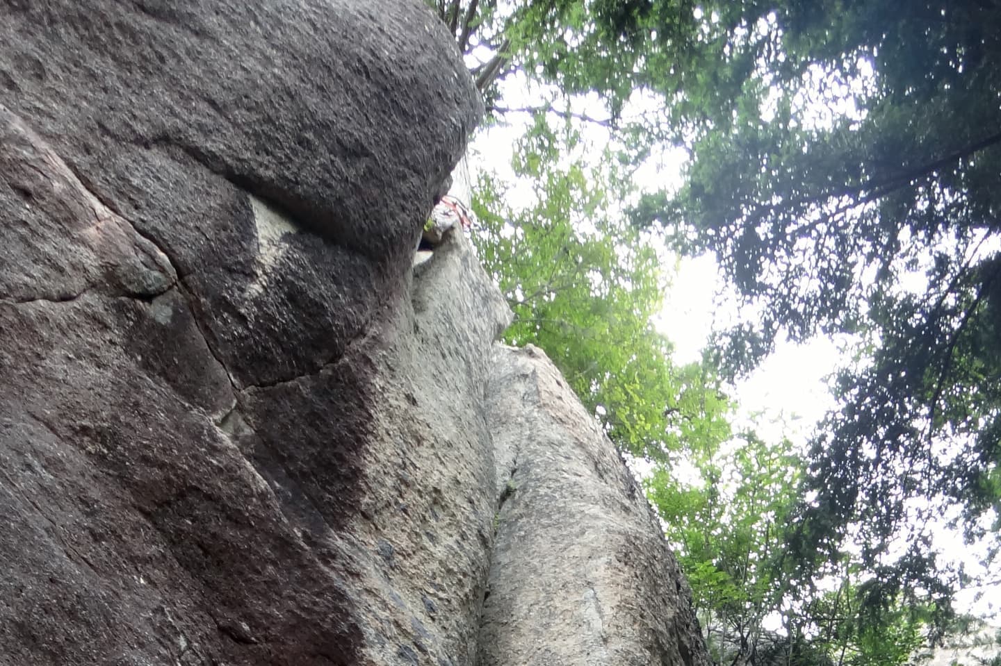 とても迫力のあるルートで、基部に立つと威圧感満載。長く持久力の必要なルート。ワイド部分は5.8程度だがワイド慣れしていないとここで跳ね返される。