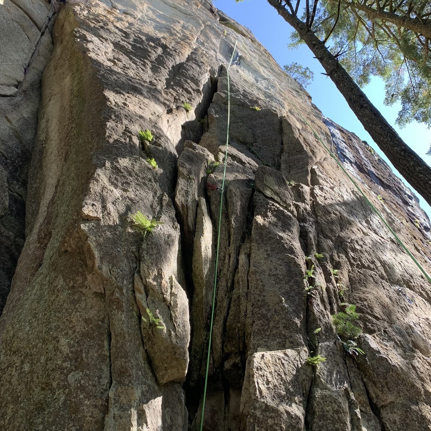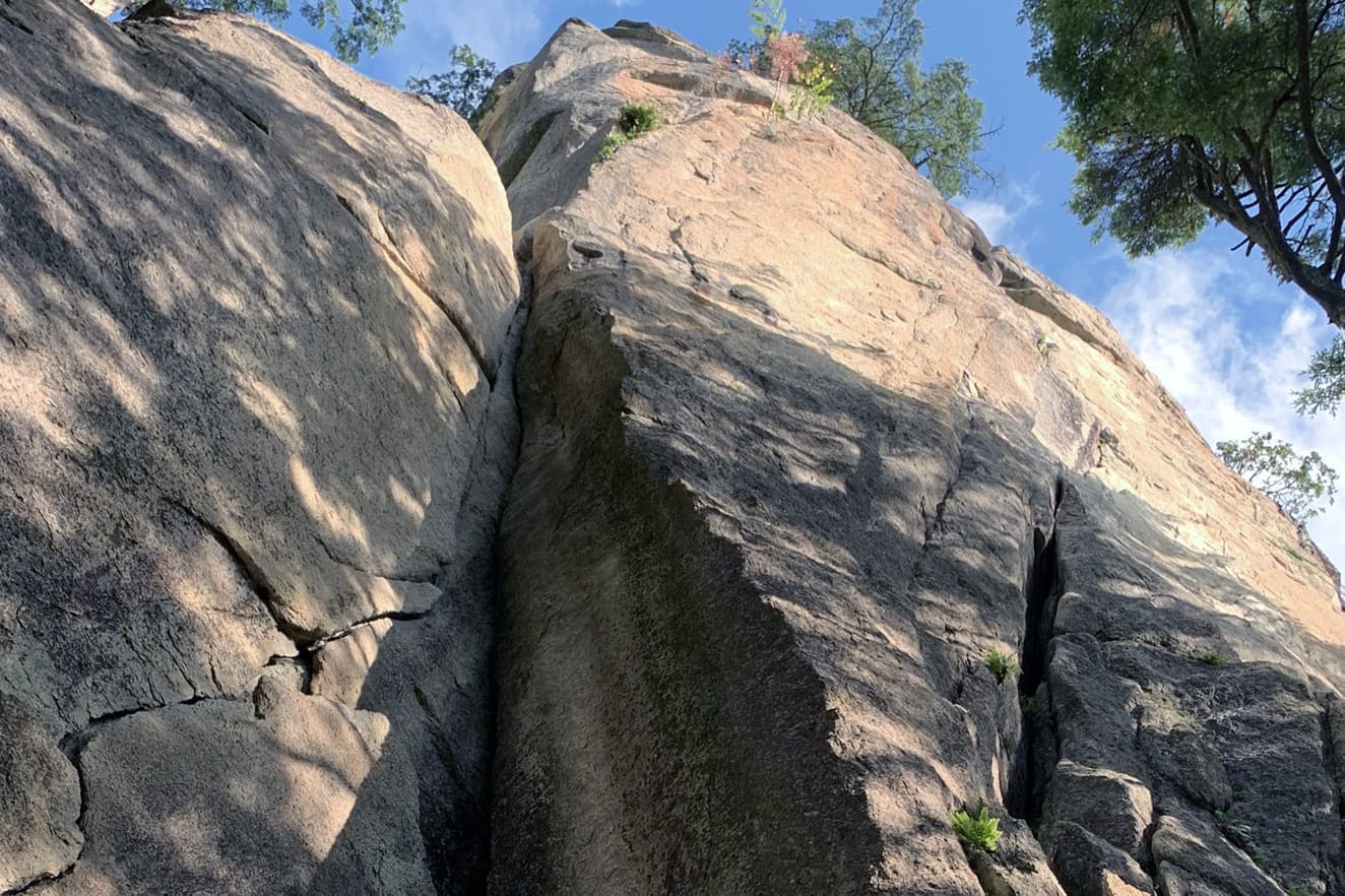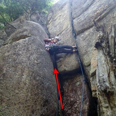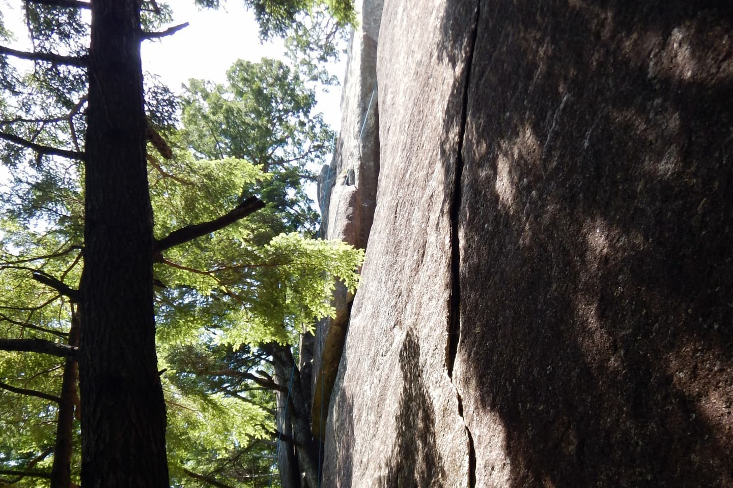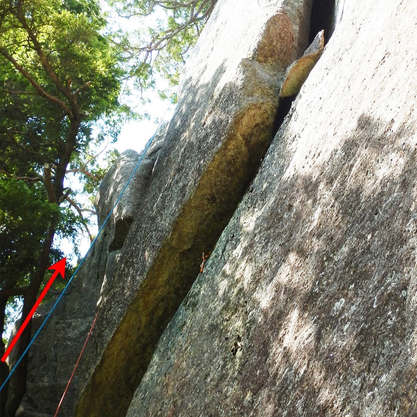 ワイドからフィンガーサイズのクラック。中間から上での墜落は後ろの木に激突の可能性あり。要注意(経験者談)